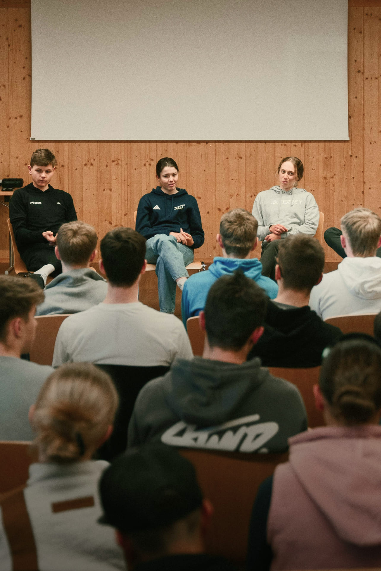 A group discussion in a seminar room with young participants at AREA 47, Ötztal, Tirol