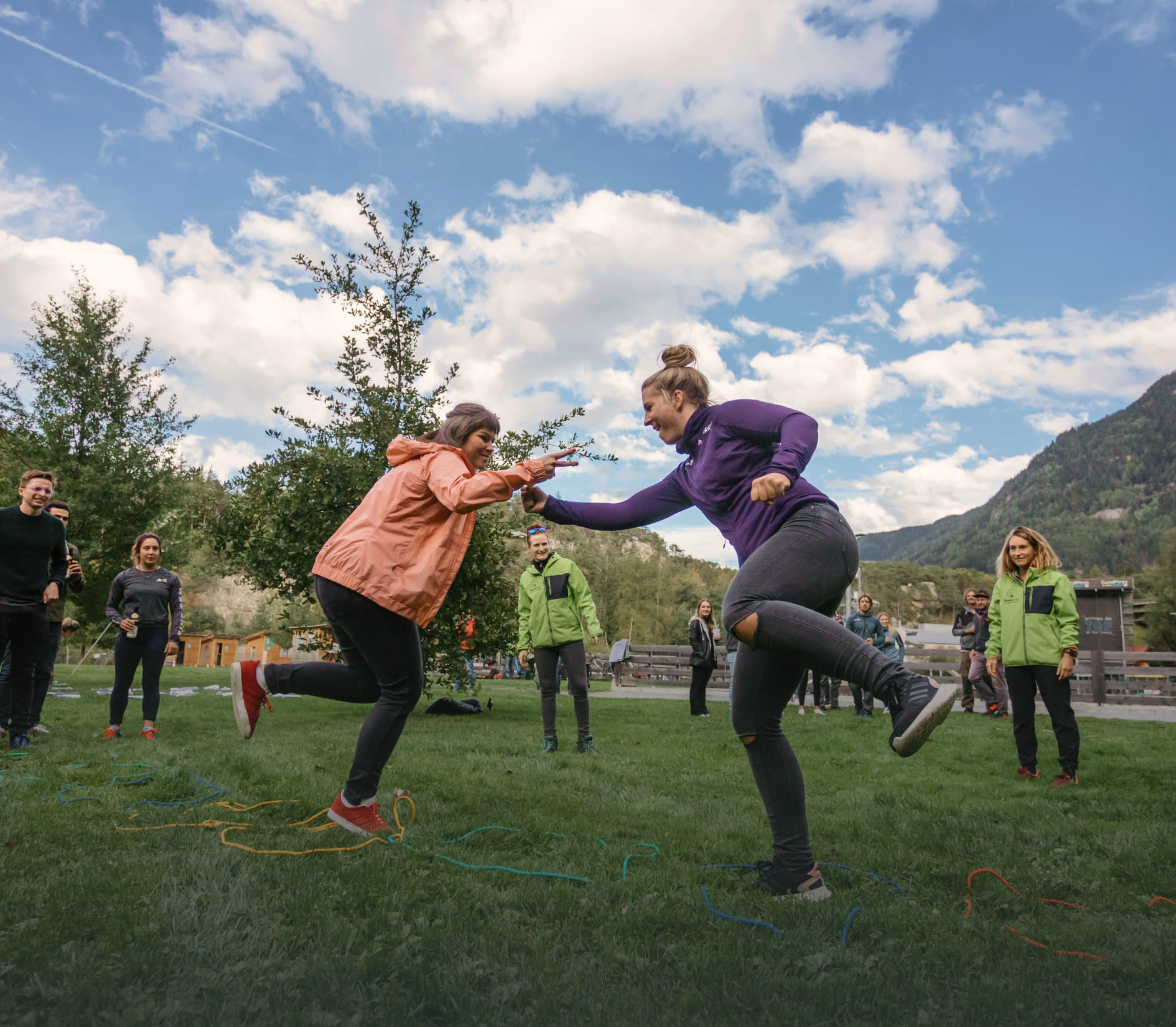 Participants engaged in a team-building rope exercise at AREA 47, Ötztal, Tirol