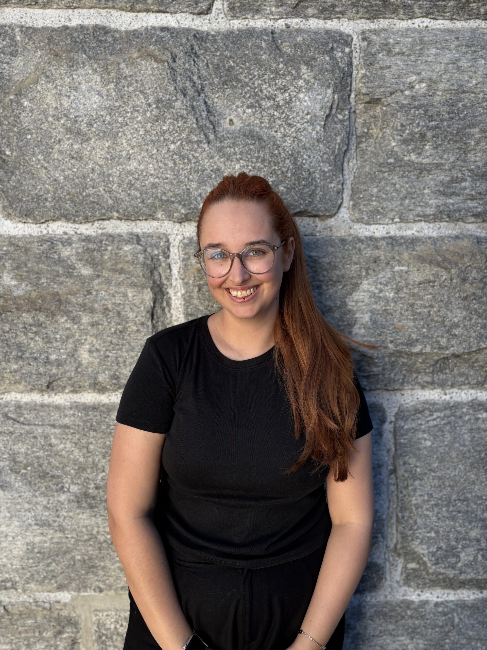 Porträt einer Mitarbeiterin mit braunem, langem Haar vor einer Steinwand in der AREA 47 im Ötztal, Tirol