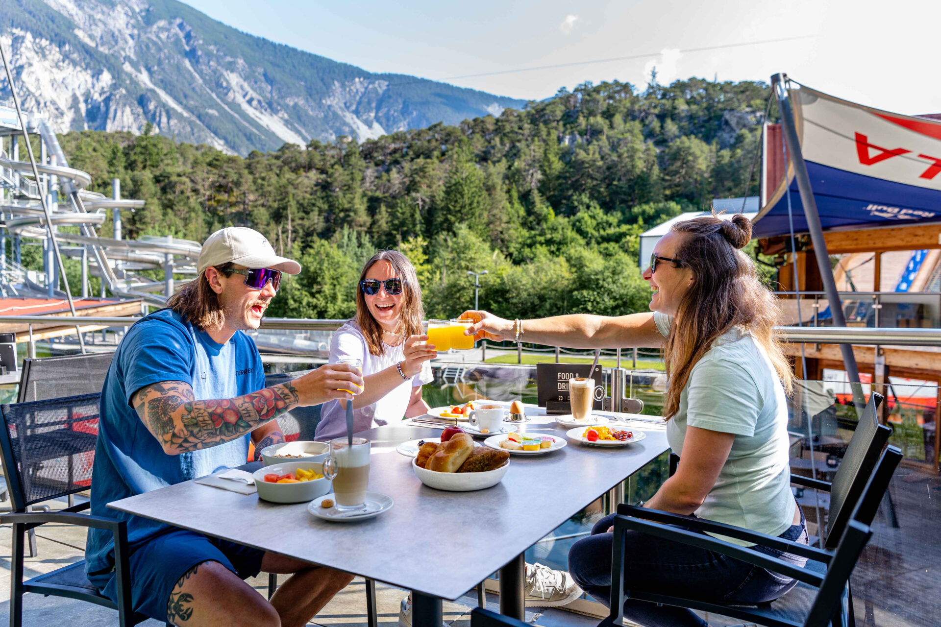 Die Terrasse vor dem Lakeside Restaurant bedeutet erste Reihe fußfrei und öffnet einen beeindruckenden Blick auf die Water AREA. Hab Spaß, wenn du den anderen beim Blobbing,